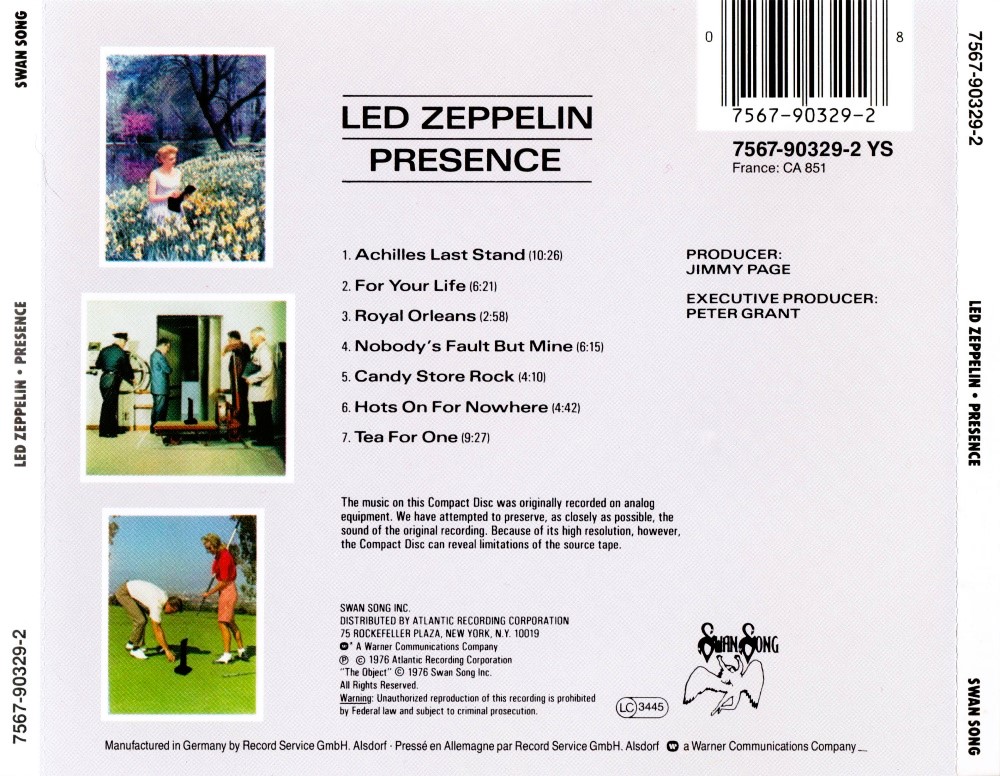 Album Description Available in: Presence is the seventh studio album by English rock band Led Zeppelin, released by Swan Song Records on 31 March 1976. It was written and recorded during a tumultuous time in the band's history, as singer Robert Plant was recuperating from serious injuries he had sustained in a recent car accident. The album received mixed reviews from critics and is one of the lowest sellers in the band's catalogue. Nonetheless, guitarist Jimmy Page describes Presence as the band's "most important" album, proving they would continue despite their turmoil.