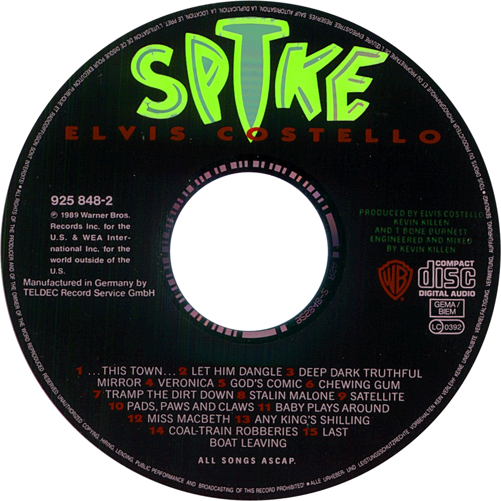 Album Description Available in: Spike is the 12th studio album by the British rock singer and songwriter Elvis Costello, released on compact disc as Warner Brothers 25848. It was his first album for the label. It peaked at No. 5 on the UK album chart.