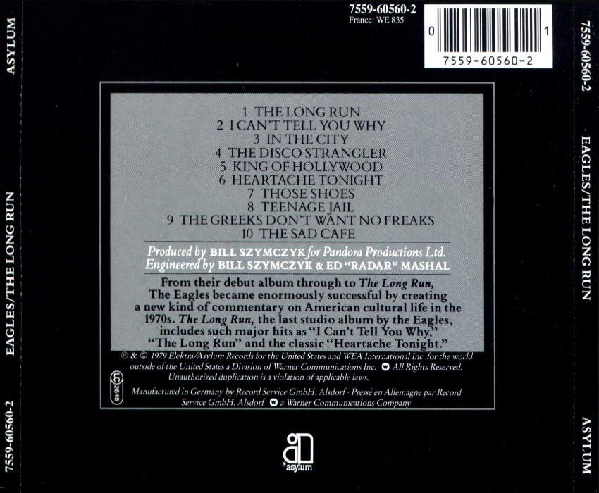 The Long Run is the sixth studio album by the American rock group the Eagles, released in 1979. This was the first Eagles album not to feature founding member Randy Meisner, who was replaced by Timothy B. Schmit. This was also the last studio album until 2007's Long Road Out of Eden, and final studio album for Asylum Records