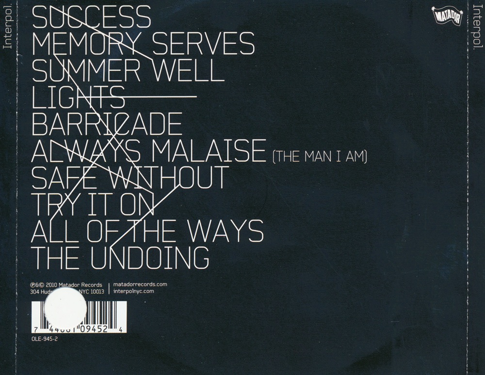 Interpol is the fourth studio album by the American post-punk revival band Interpol, released on September 7, 2010 on Matador Records. The album was recorded at Electric Lady Studios in Greenwich Village. "Lights" was released as a free download through the band's website, originally in May 2010 with an accompanying video released in June 2010 by Charlie White. Bassist Carlos Dengler left shortly after the album's completion. The lead single "Barricade" was released in August 2010.