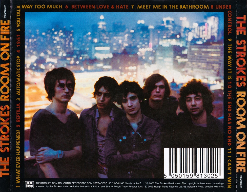 Room on Fire is the second studio album by American indie rock band The Strokes. Released in October 2003, it follows 2001's Is This It and includes three singles: "12:51", "Reptilia", and "The End Has No End." Grammy-winning producer Nigel Godrich was initially in charge of production, but The Strokes felt he made the songs seem "soulless". The band went back to work with Is This It producer Gordon Raphael. The album features a slightly smoother sound than its predecessor. The bass guitar is less present except for several moments when it becomes the focal point of the song. The album title Room on Fire was drawn from a line in "Reptilia": "The room is on fire as she's fixing her hair." The record received positive reviews upon release. It reached number two on the UK Albums Chart and debuted at number four in the U.S. on the Billboard 200, where it went on to sell 597,000 units by October 2006 [citation needed] and was certified Gold.