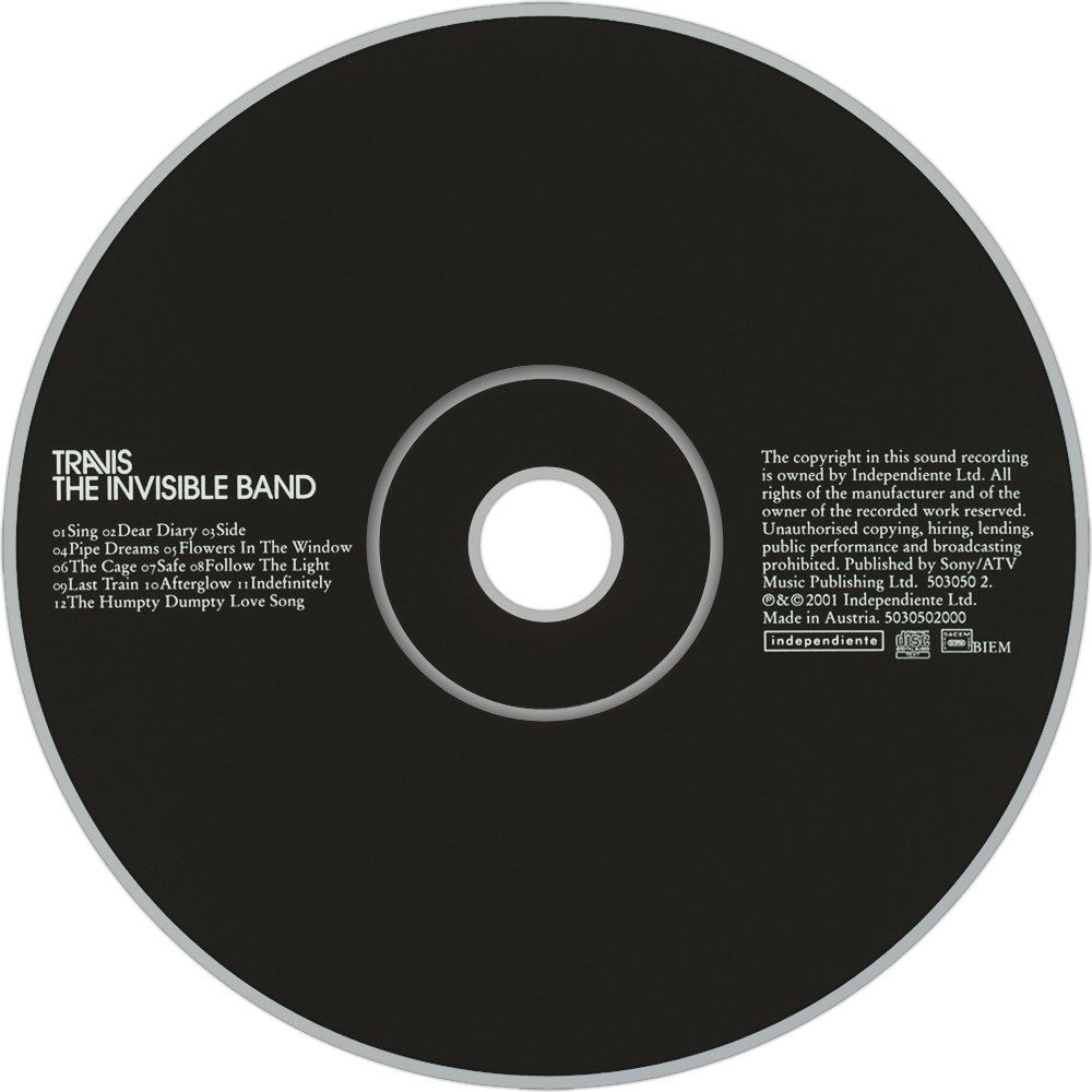 The Invisible Band is the third studio album from Scottish indie pop band Travis. The album was released on June 11, 2001. The title of the album makes reference to the band's feelings regarding 'music being more important than the band making it'. Band frontman Fran stated in an interview that the album's title referred to the band's status in 'having famous songs, but not being famous themselves'. The album spent four weeks at the top of the UK Albums Chart, selling more copies in that time than The Man Who managed in half a year.