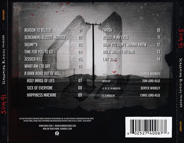 Screaming Bloody Murder is the fifth studio album by Canadian punk rock band Sum 41, released on March 29, 2011, after many delays. It was the band's second album produced by the band's frontman Deryck Whibley and recorded as a three piece, and the first album by the band since 2007's Underclass Hero, which marks the longest gap between two Sum 41 albums. Even though new lead guitarist Tom Thacker was already a part of the band and co-wrote the title track of the album, all guitars were still recorded by singer Deryck Whibley. The album is lyrically and musically darker than most of their previous work. As of October 2012 it has sold 97,000 copies in the United States.