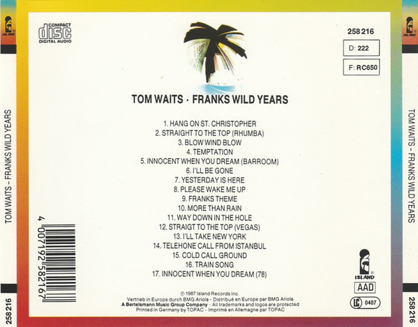 Franks Wild Years is an album by Tom Waits, released 1987 on Island Records. Subtitled "Un Operachi Romantico in Two Acts", the album contains songs written by Waits and collaborators (mainly his wife, Kathleen Brennan) for a play of the same name. The shared title of the album and the play is an iteration of "Frank's Wild Years", a song from Waits' 1983 album Swordfishtrombones.