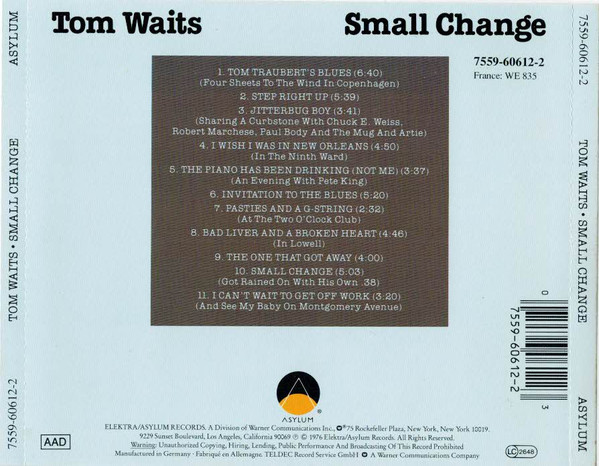 Small Change is the fourth studio album by singer and songwriter Tom Waits, released on September 21, 1976 on Asylum Records. It was recorded in July at Wally Heider's Studio 3 in Hollywood. It was successful commercially and outsold his previous albums. This resulted in Waits putting together a touring band - The Nocturnal Emissions, which consisted of Frank Vicari on tenor saxophone, FitzGerald Jenkins on bass guitar and Chip White on drums and vibraphone. The Nocturnal Emissions toured Europe and the United States extensively from October 1976 till May 1977.
