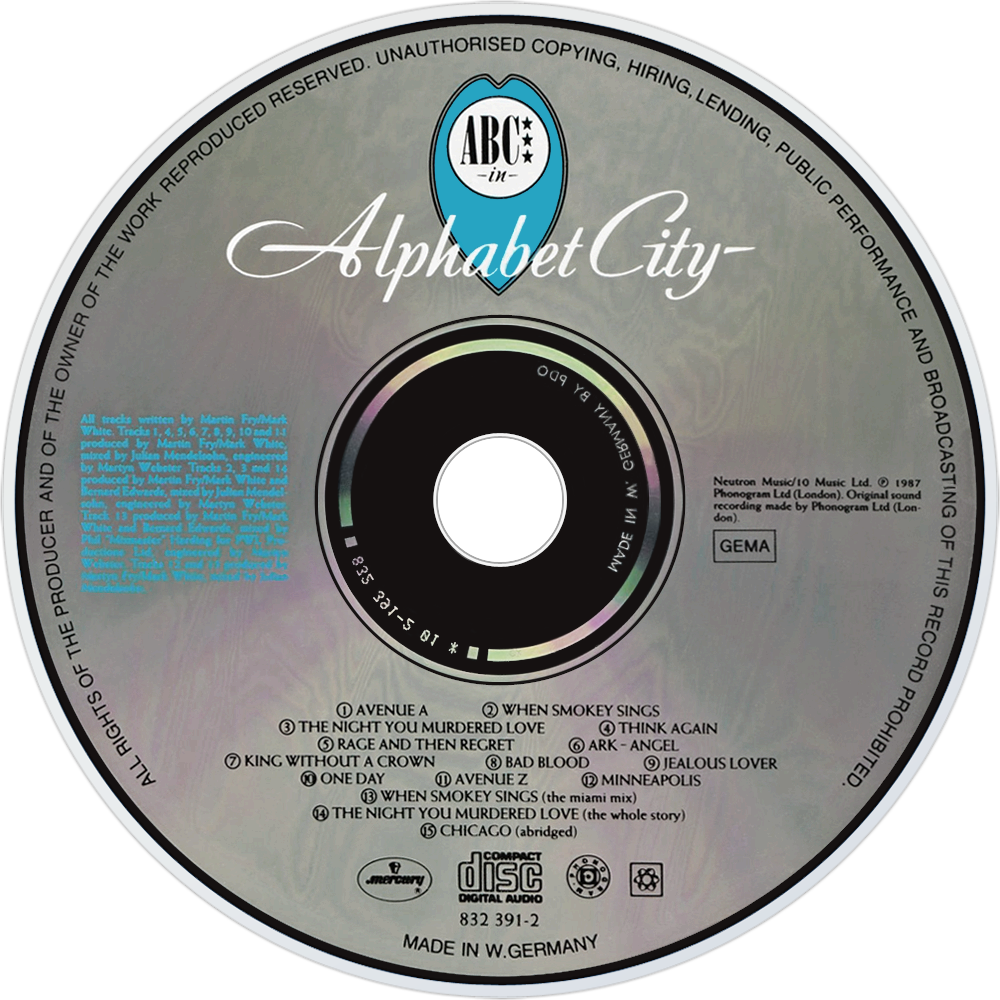Alphabet City is the fourth studio album by English pop band ABC. It was originally released in October 1987, on the labels Mercury, Phonogram and Neutron, two years after their previous album How to Be a ... Zillionaire! Following a hiatus in which singer Martin Fry was being treated for Hodgkin's disease, it was recorded over a period of nine months between November 1986 and August 1987, in sessions that took place at Marcus Recording Studios in London, assisted by Bernard Edwards, best known for his work with the American band Chic.