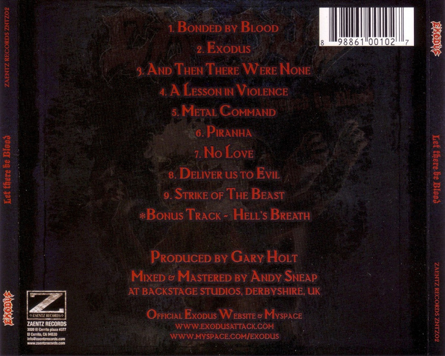 Let There Be Blood is a re-recording of Exodus's 1985 album Bonded by Blood, featuring their modern lineup. The only band members who play on both Bonded by Blood and Let There Be Blood are guitarist Gary Holt and drummer Tom Hunting. The track "Hell's Breath" originally appears on the "1983 Rehearsal" and never was recorded officially.
