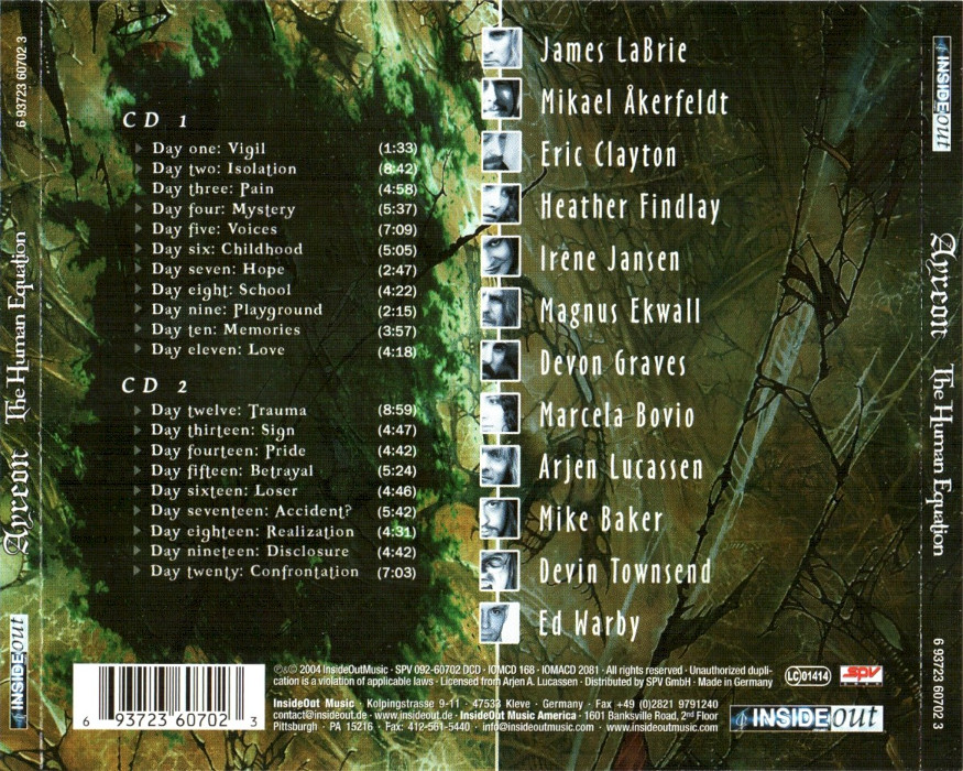 The Human Equation is the sixth album of progressive metal/rock opera Ayreon by Dutch songwriter, producer, singer, and multi-instrumentalist Arjen Anthony Lucassen, released on May 25, 2004 via InsideOut Music. As with other Ayreon albums, it features guest appearances from several musicians previously unrelated to the project, including James LaBrie of Dream Theater, Mikael Ã…kerfeldt of Opeth, Eric Clayton of Saviour Machine, and Devin Townsend, performing music arranged and written by Lucassen.