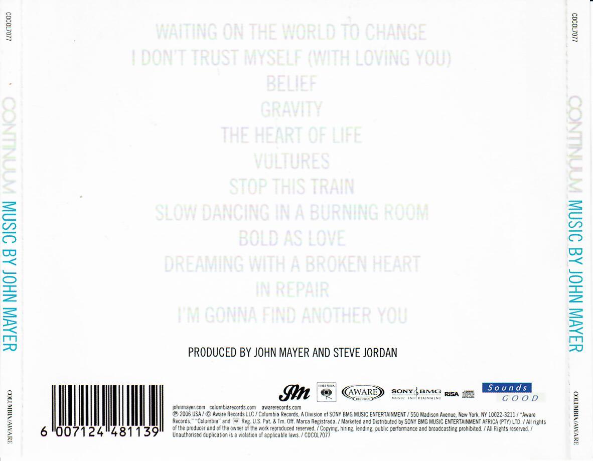 Continuum is the third studio album by American musician John Mayer, released September 9, 2006 on Columbia Records. Recording sessions for the album took place during November 2005 to September 2006 at The Village Recorder in Los Angeles, California, Avatar Studios and Right Track/Sound on Sound in New York City, and Royal Studios in Memphis, Tennessee. Production was handled primarily by Mayer and Steve Jordan. It marked a change in Mayer's musical style, and incorporated musical elements of blues and soul more heavily than in his previous work with pop-rock.