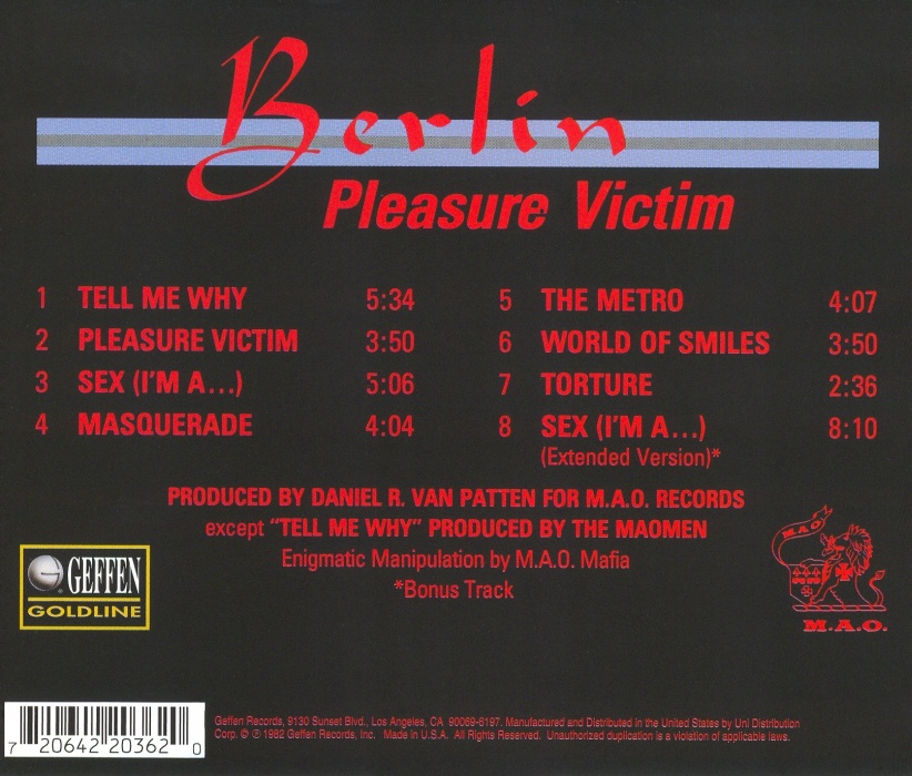 Album Description Available in: Pleasure Victim is the second studio album by the American New Wave band, Berlin, released in 1982. To date, it is Berlin's best selling album and was certified gold by the RIAA in September 1984 and platinum in February 1993.
