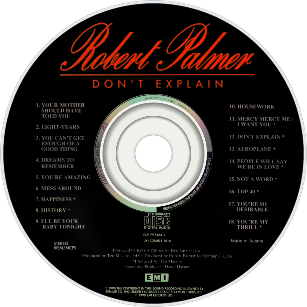 Don't Explain is the tenth solo studio album by Robert Palmer, released in 1990. During the course of its 18 tracks, Palmer displays rock, R&B, jazz and Bahamian influences. It featured two UK top 10 hits with covers of Bob Dylan's "I'll Be Your Baby Tonight" – collaboration with UB40 – and Marvin Gaye's cover "Mercy Mercy Me". Several classic songs are covered, as well.