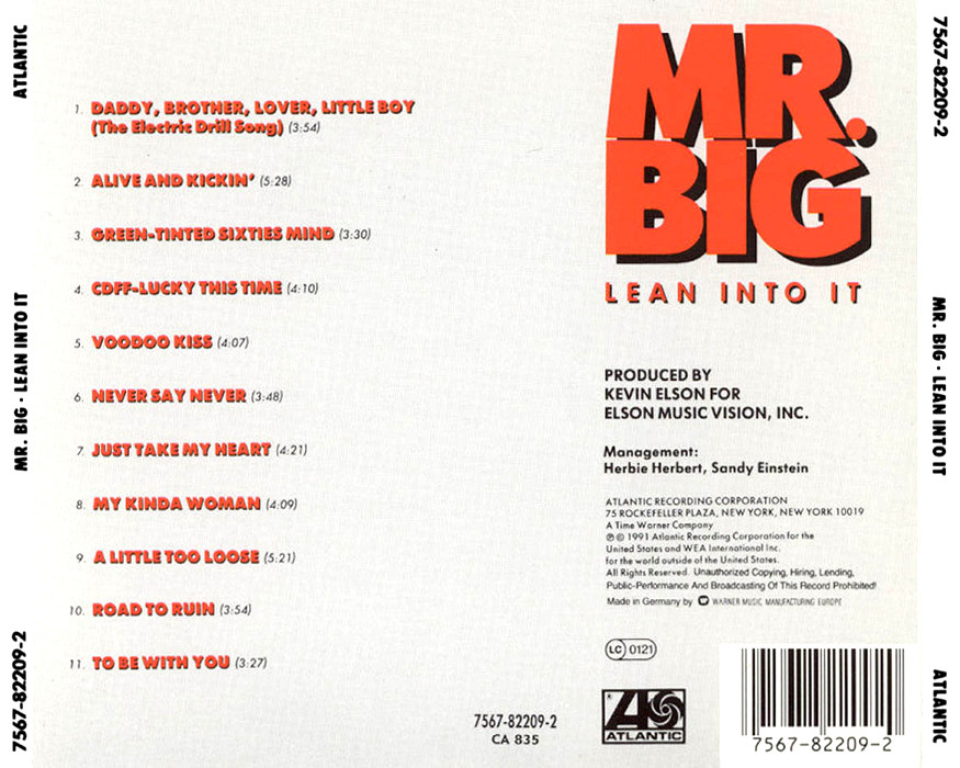 Lean into It is the second studio album by the American rock supergroup Mr. Big, released in 1991. The band's breakthrough release, Lean into It peaked at number 15 on the Billboard 200 charts, while the single "To Be with You" became the band's first and only song to hit number 1 on the Billboard Hot 100. The follow-up single, "Just Take My Heart", was another Top 40 hit, peaking at number 16 on the Billboard Hot 100.