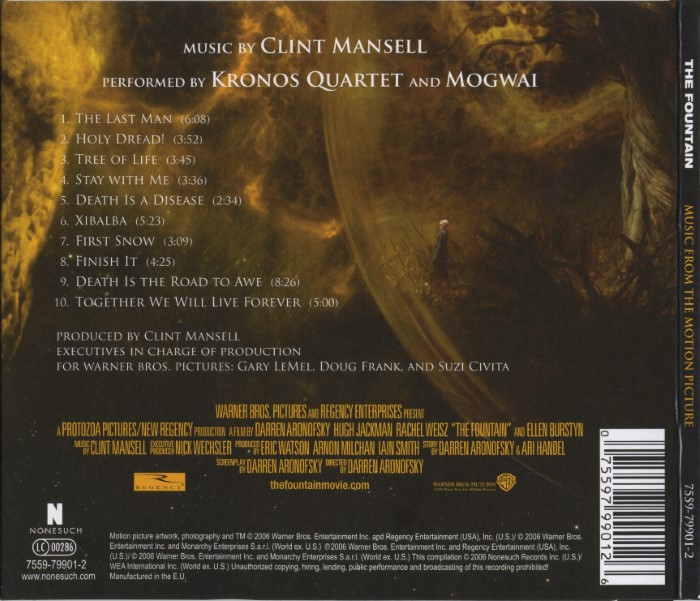The Fountain: Music from the Motion Picture is the soundtrack album to the 2006 film The Fountain directed by Darren Aronofsky. Released on November 27, 2006, through Nonesuch Records, the album is a collaboration between contemporary classical composer and frequent Aronofsky collaborator Clint Mansell, classical string quartet the Kronos Quartet, and post-rock band Mogwai. The score received positive reviews from critics and was nominated for several awards.