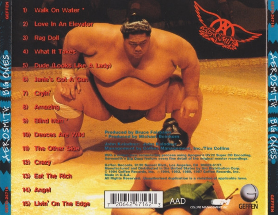 Big Ones is one of the many compilation albums by the American rock band Aerosmith, released on November 1, 1994 by Geffen Records (see 1994 in music). Big Ones featured twelve hits from the band's three consecutive multi-platinum albums, Permanent Vacation (1987), Pump (1989), and Get a Grip (1993), as well as the hit "Deuces are Wild" from The Beavis and Butt-Head Experience (1993), and two new songs, "Blind Man" and "Walk on Water", which were recorded during a break in the band's Get a Grip Tour. These songs were also included on the band's 2001 compilation album Young Lust: The Aerosmith Anthology. Big Ones is the band's second bestselling compilation album, reaching #6 on the Billboard charts, and selling four million copies in the United States alone. The album quickly became a world-wide hit reaching the Top 10 in nine countries before the end of the year.