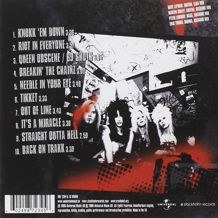 "Rest in Sleaze" is the debut album by Swedish Glam Metal band Crashdïet. The album was produced by Platform (Chris Laney and Anders Ringman) and Grizzly/Tysper (Gustav Jonsson and Tommy Tysper). The album debuted at #12 on the Swedish album chart. The band released four singles from the album; Riot in Everyone, Knokk 'Em Down, Breakin' the Chainz, and It's a Miracle.