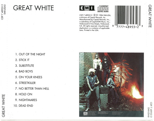Great White is the first full-length album by the American rock band Great White. Three tracks are taken from the band's previous EP, albeit in re-recorded versions. The musical style of this album is very different from the following highly successful releases of Great White, as they display here a more hard-driving metal sound as opposed to their later, blues-infused rock sound. EMI America judged the album a disaster and Great White were dropped. This led to a rethink by the band, and they became less heavy, introducing a tame hard rock sound for later albums.