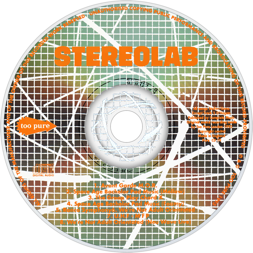 The title is spelled Space Age Batchelor Pad Music on the front cover, though not on the back cover or spine; The sleeve and label designs use artwork and text from Vanguard Records' "Stereolab" hi-fi test record after which the group was named, including the "flagbearer on horseback" logo of Vanguard Records itself. The EP title was later used by Bar/None Records for a 1994 compilation of tracks by Mexican lounge music legend Juan GarcĂa Esquivel.