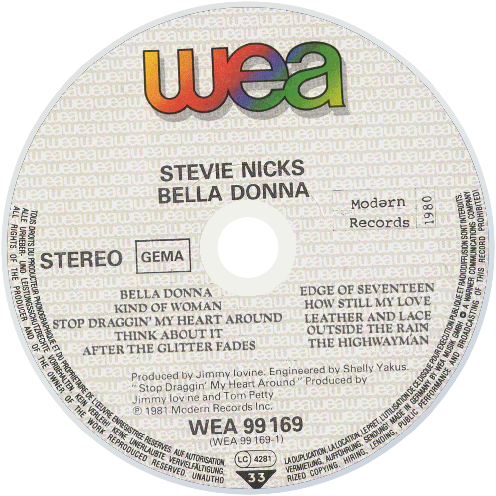 Bella Donna is the debut studio album by American singer-songwriter and Fleetwood Mac vocalist Stevie Nicks. Released on July 27, 1981, the album hit #1 on the U.S. Billboard charts in September of that year with sales of 297,000 copies, remaining there for one week. Bella Donna was awarded Platinum status by the RIAA on October 7, 1981, less than three months after its release, and has since been certified quadruple-platinum.