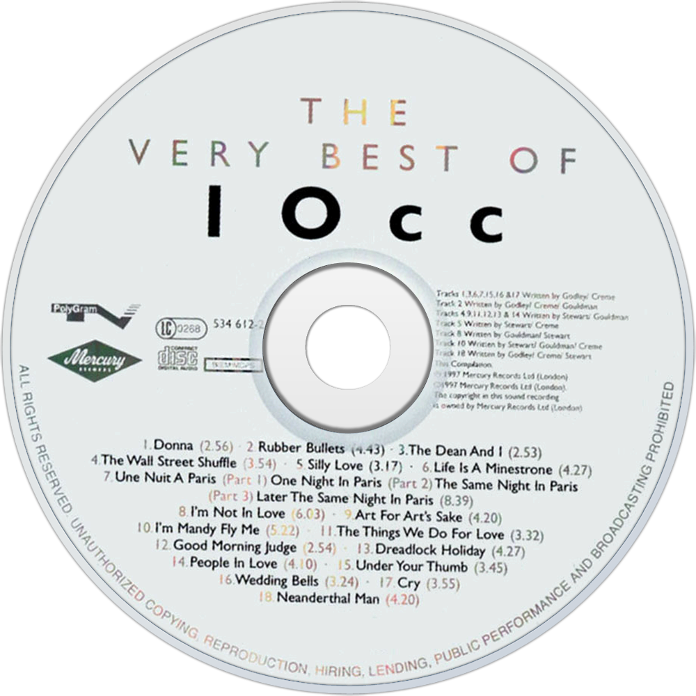 The Very Best of 10cc is a 1997 compilation album by the band 10cc. The album comes with an exclusive essay written by Chris White especially for it. It was released in the UK with 18 tracks and in the USA with 15 tracks (adding For You And I and deleting four tracks: Une Nuit A Paris; Under Your Thumb; Wedding Bells; and, Neanderthal Man. The album features all of the highest charting material from the band's career and also features several songs by Godley & Creme and (in the UK edition) Neanderthal Man by Hotlegs, acts closely associated with 10cc. The album charted at #37 on the UK Albums Chart.