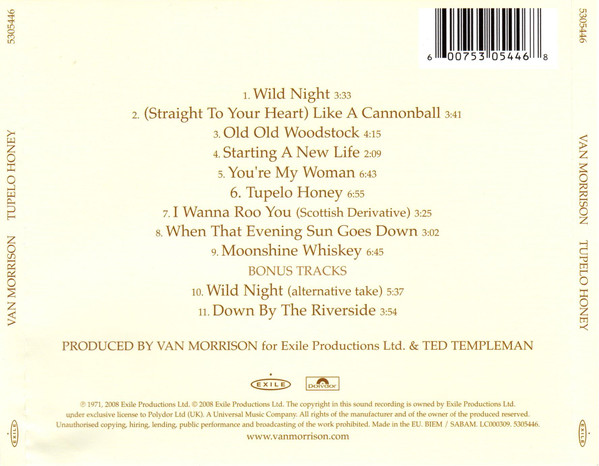 Tupelo Honey is the fifth solo album by Northern Irish singer-songwriter Van Morrison. It was released in October 1971 by Warner Bros. Records. Morrison had written all of the songs on the album in Woodstock, New York before his move to Marin County, California, except for "You're My Woman", which he wrote during the recording sessions. Recording began at the beginning of the second quarter of 1971 at the Wally Heider Studios, San Francisco. Morrison moved to the Columbia Studios in May 1971 to complete the album.