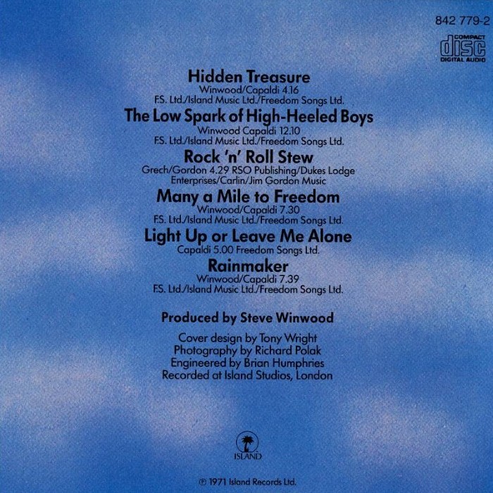 The album features the hit "Rock & Roll Stew (part 1)" and the FM hit, "The Low Spark of High Heeled Boys." This is the only original Traffic album to feature two lead vocals by Jim Capaldi ("Light Up Or Leave Me Alone" and "Rock & Roll Stew"). His only other unaccompanied vocal on a Traffic studio album was "Dealer" from Mr. Fantasy. The LP is also notable for its die-cut cover.