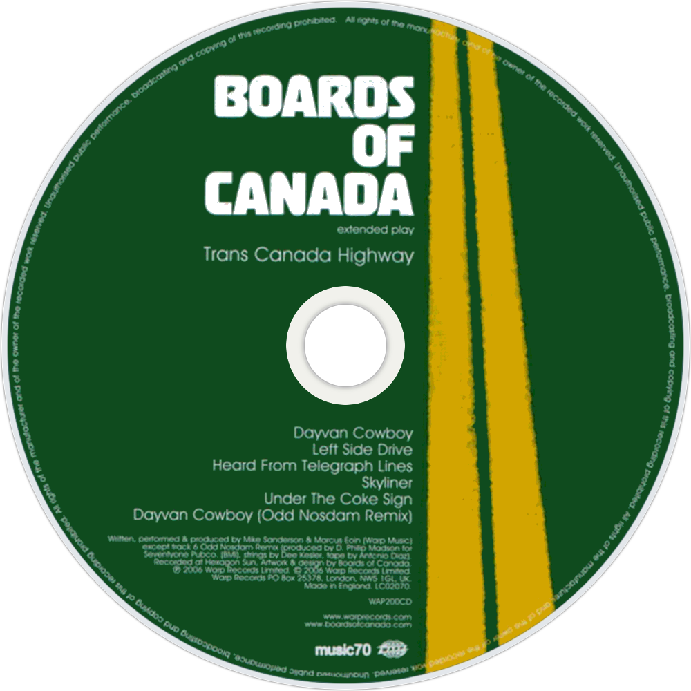 Trans Canada Highway is an EP by the Scottish IDM duo Boards of Canada. It was released on 29 May 2006 by Warp Records. According to Boards of Canada's official site, the EP was originally scheduled for release on 6 June 2006. (That date being written numerically as 6/6/06, harking back to their use of the number 666 on the album Geogaddi.) The retail vinyl release of the EP is pressed on white vinyl.