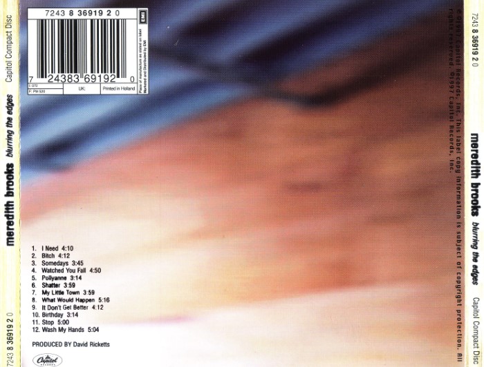 Meredith Brooks' debut album, Blurring the Edges is one of the most blatant examples of post-Alanis Morissette marketing by the record industry. At her musical core, Brooks is more like Sheryl Crow -- namely, a classic rocker with slightly edgy lyrics. She even works with producer David Ricketts, the former partner of Crow's Tuesday Night Music Club collaborator, David Baerwald. Ricketts gives Blurring the Edges a radio-friendly polish, one that glosses over any of the grit in Brooks' songs. And on the album's first single, "Bitch," Brooks and Ricketts devise an Alanis clone, from the semi-profane lyrics to the caterwauling chorus. "Bitch" isn't indicative of the rest of the album, which is considerably calmer and aimed at adult alternative stations, and while she fits neatly into the confines of that format, she doesn't really do anything to distinguish herself from the legions of similar post-alternative singer/songwriters. Blurring the Edges isn't necessarily a bad album -- Brooks is a competent melodicist and her lyrics are occasionally promising -- yet it isn't a distinctive one.