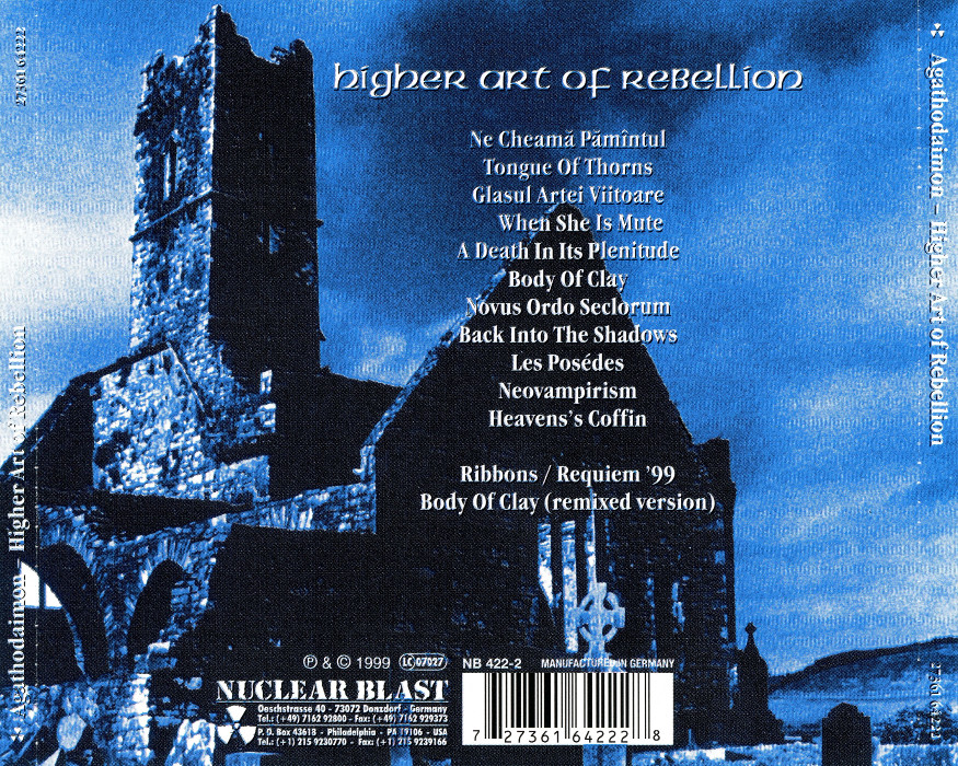 Higher Art of Rebellion is the second full-length studio album by the German symphonic black metal band Agathodaimon, released November 29, 1999 on the Nuclear Blast label . In 2009 Metal Mind Productions reissued the album as a remastered digipak edition. The reissue is limited to numerated 2000 copies and was digitally remastered using 24-Bit process on golden disc. It also retains the 2 bonus tracks of the previously released limited edition version of the album.
