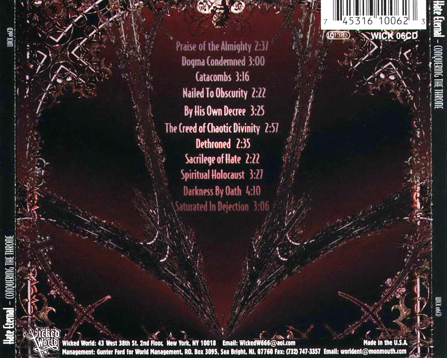 Conquering the Throne is the debut album by Hate Eternal. It was released on November 2 of 1999 on Wicked World Records, a subdivision of Earache Records. Album cover is from the right portion (Hell) of Hans Memling's painting The Last Judgment. Drummer Tim Yeung made his recording debut on this album.