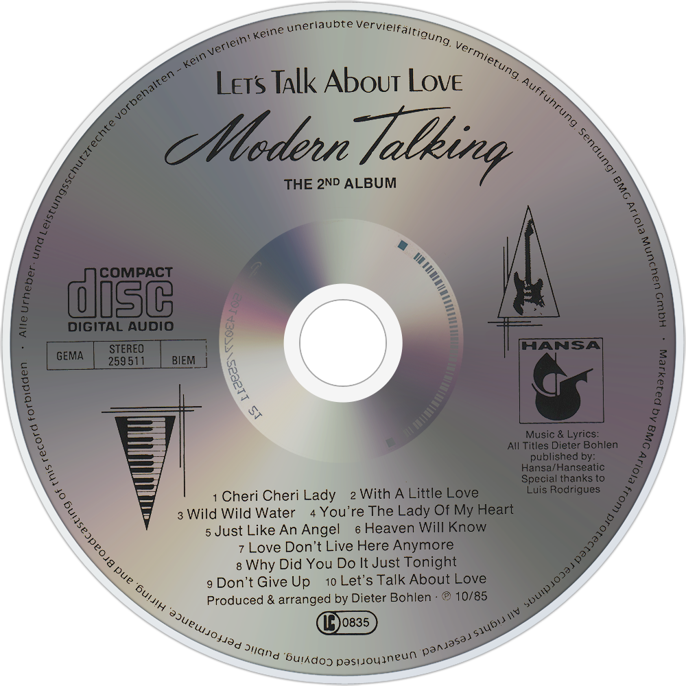 Let's Talk About Love is the second album by Modern Talking which was released on 14 October 1985 in Germany and other territories. This album saw a release of only one single Cheri, Cheri Lady which is considered one of Modern Talking's smash hits to date. The single peaked at No.1 in many countries including Germany (where it spent four weeks at No.1), Switzerland, Austria and Norway. The album Let's Talk About Love, produced by Hansa Records and released by Ariola, BMG, peaked at No. 2 on November 4, 1985 in Germany and spent four weeks at that position. After spending 11 weeks within the top-10 and total 44 weeks in the album chart, it eventually earned a platinum-award selling well over 500,000 units in Germany alone.