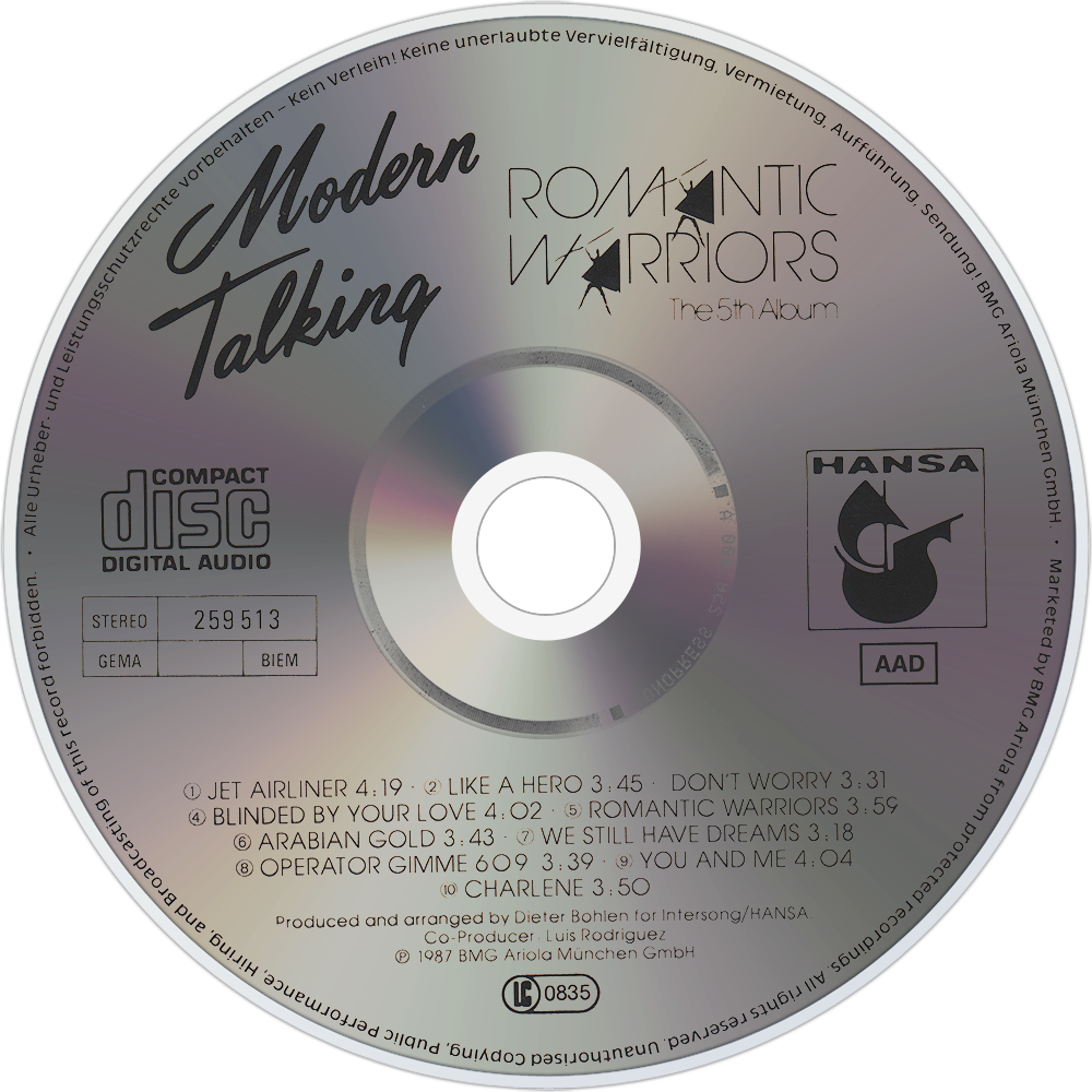 "Romantic Warriors" is the fifth studio album by Modern Talking, released on 8 June 1987 in Germany and elsewhere. It contains the single "Jet Airliner" which entered the top-10 in Germany and Austria while entering the top-20 in Switzerland and Sweden. Romantic Warriors, produced by Hansa Records and released by Ariola, BMG, peaked at No. 3 in Germany on July 6, 1987 and spent total of four weeks within the top-10.