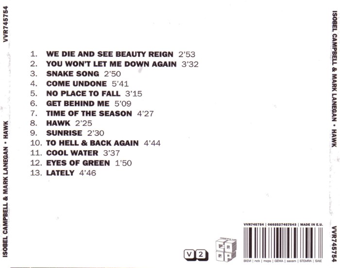 Hawk is the third collaborative studio album by Scottish indie pop singer Isobel Campbell and American alternative rock musician Mark Lanegan, released on 24 August 2010 on V2 Records. Recorded throughout the United Kingdom and the United States, Hawk features a number of guest musicians, including folk singer Willy Mason, bassist Bill Wells and former Smashing Pumpkins guitarist James Iha.