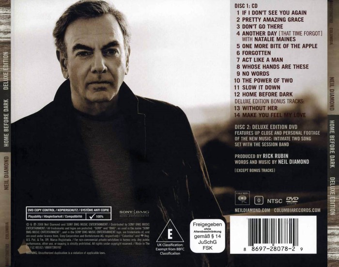 Home Before Dark is the twenty-seventh studio album by American singer-songwriter Neil Diamond. Released on May 5, 2008; it was the artists second album for American Recordings.