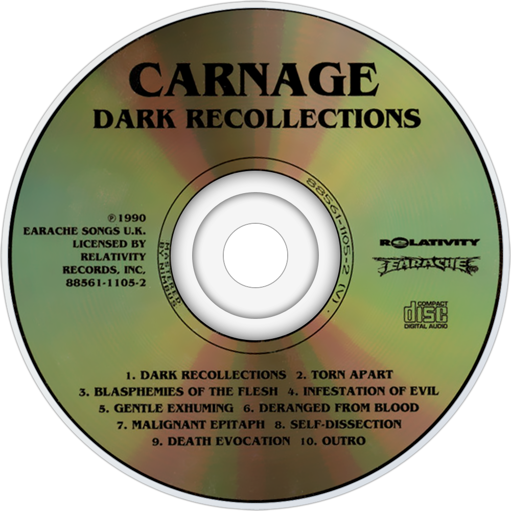 Dark Recollections is the only album by the death metal band, Carnage, released in 1990. It was originally released as a split CD with Cadaver's debut album Hallucinating Anxiety on the Earache Records sublabel Necrosis. Some of the songs were later re-recorded by Dismember. Dark Recollections is the only album released by Carnage, the band had broken up by the time the album hit the streets. It was later reissued by Earache Records with 8 additional tracks, taken from the demos for The Day Man Lost and Infestation of Evil.