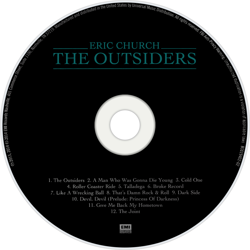 Just in case the title of The Outsiders doesn't give away the game, Eric Church takes pains to strike a defiant stance throughout his fourth album, underscoring his status as a genuine Nashville Rebel. He sings about his "Dark Side" and the Devil, murmurs ominously about "A Man Who Was Gonna Die Young," winks a double entendre about "The Joint," and declares "That's Damn Rock & Roll," a provocative statement from a singer who is nominally country but loves to strut with a heavy metal swagger. Church brings on the thunder with "The Outsiders," a galumphing rallying cry that's intended as a middle finger to all those cheerful bros in tight-fitting jeans who sing songs about trucks set to a hip-hop beat. He may sneer at those good-looking suburban country dudes riding the top of the charts but Church is a modern man -- he decorates the kiss-off "Cold One" with a skittish electronic funk beat -- who doesn't take a second glance at the past, unless it's to tip a hat to Hank, Hag, Jones, or Waylon or to deliver the slow-burning Southern soul of "Like a Wrecking Ball." Contrary to the bluster of "The Outsiders" and "That's Damn Rock & Roll," Church doesn't follow the macho straight and narrow on The Outsiders. Surely, he never disguises his masculine side but sings sweetly, too, and he indulges in detours, the craziest being the prog pomposity of the eight-minute suite "Devil, Devil (Prelude: Princess of Darkness)." Most of all, he takes strides to paint himself as the heir apparent to workingman's hero Bruce Springsteen -- previously, Church only poached Bruce's last name for one of the biggest hits from 2011's Chief, the album that turned Church into a star -- going so far as to write an anthem to dying middle-class America called "Give Me Back My Hometown." Designed to be a set closer at arenas across the U.S., it delivers the requisite fireworks but Church possesses a sly eye for detail that humanizes his broad strokes, a necessary counterpoint to songs that are otherwise outsized. This shift toward the epic -- present throughout The Outsiders but not always dominating the tone -- is a real shift for Church, who has otherwise specialized in songs that are a little simpler. That directness played a big role in making Chief a hit and it's sometimes missed on The Outsiders, as the XXL-sized songs don't always stick but the ambition is admirable. Church has made the conscious decision to try a little bit of everything in his quest to be a savior to both rock and country, and if he doesn't quite knock it out of the park when he swings for the fences, he nevertheless scores.