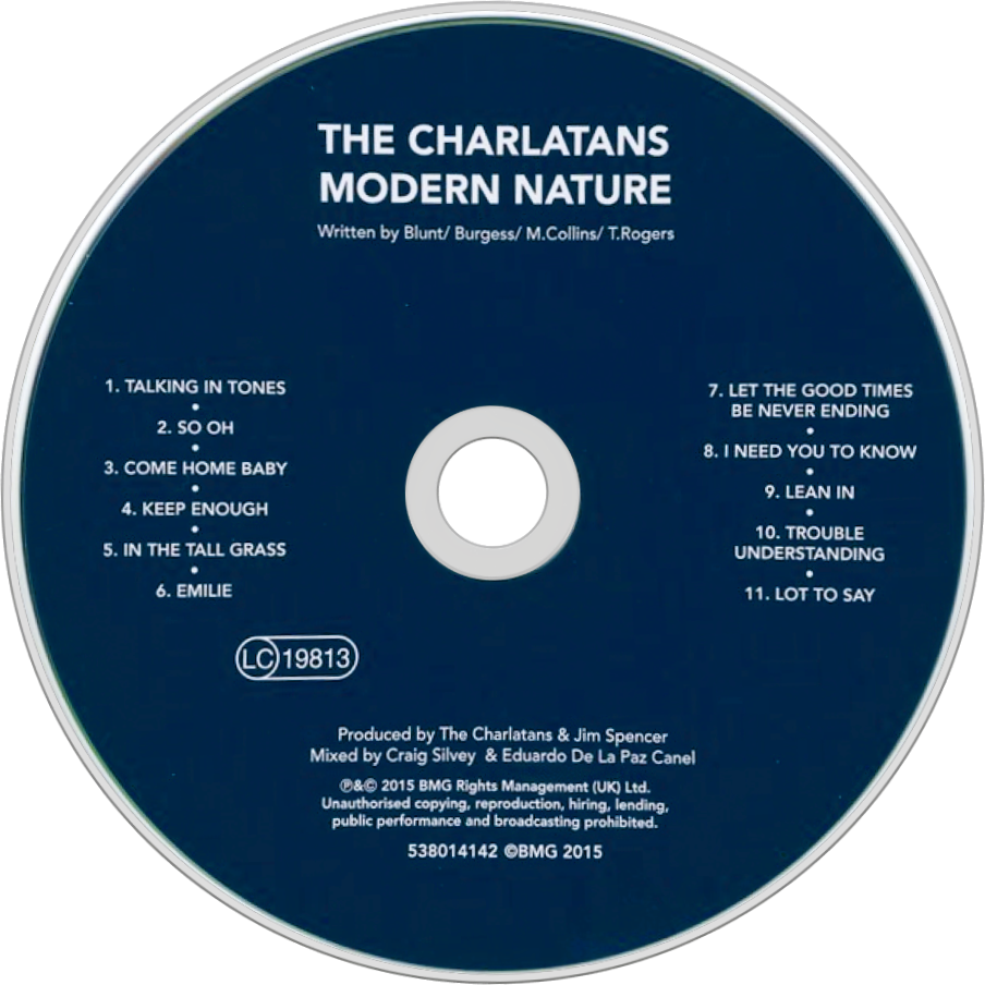 "Modern Nature" is the 12th studio album by British alternative rock band The Charlatans, released on 26 January 2015 on the BMG label. The album charted at No. 7 in the UK album charts with over 10,000 units sold, making it the highest charting album since Wonderland in 2001. A Deluxe edition was also released featuring a further four bonus tracks.