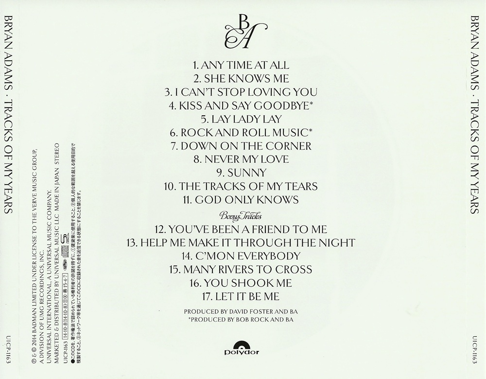"Tracks of My Years" is the twelfth studio album by Canadian singer-songwriter Bryan Adams, released September 30, 2014 on the Verve label. It is an eclectic mix of songs reflective of the time when rock was played alongside pop, country and R&B. The track list features 10 covers and an original song written by Adams and Jim Vallance, which was released as the album's first and only single.