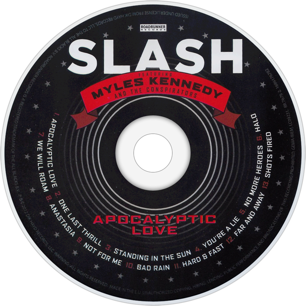 Apocalyptic Love is the second solo-project studio album by former Guns N' Roses guitarist Slash. However, it is also the first studio album billed to Slash feat. Myles Kennedy & The Conspirators. The band features vocalist Myles Kennedy, bassist Todd Kerns and drummer Brent Fitz in addition to Slash on guitar. Produced by Eric Valentine, it was released on May 22, 2012.