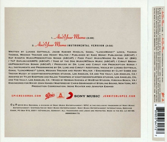 "Ain't Your Mama" is a song recorded by American singer Jennifer Lopez. It was written by Meghan Trainor, Theron Thomas, Jacob Kasher Hindlin, Gamal "Lunchmoney" Lewis, Henry "Cirkut" Walter and Dr. Luke, while production was handled by the latter two. A pop song with influences of reggae, dancehall and Latin music, the song has percussion, drums, minimal synths and a Latin beat in its main instrumentation. Lyrically, "Ain't Your Mama" deals with themes of female empowerment, where the protagonist will not accept a partner who needs to be taken care of.