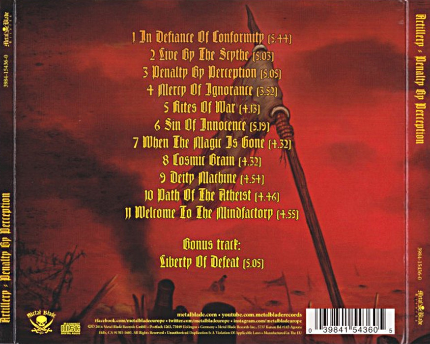 Album Description Available in: Penalty by Perception is the eighth studio album by Danish thrash metal band Artillery, released on 25 March 2016 on Metal Blade Records. It was recorded throughout 2015 in Medley Studios, Copenhagen. The band also re-recorded the 1991 demo “Welcome to the Mindfactory” on this album.