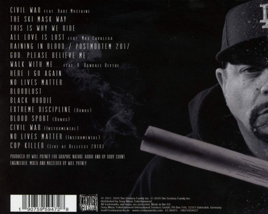 The opening track "Here I Go Again" is a re-recording of a demo track from vocalist Ice-T's Return of the Real sessions. In its first week, it debuted at #3 in the UK Rock and Metal Chart. The track "Black Hoodie" was nominated for Best Metal Performance at the 60th Annual Grammy Awards. The second track, "No Lives Matter", addresses the role of race in social inequality. The third track, "All Love Is Lost," is about husbands who are having an affair with their mistresses behind their wives' backs and features Max Cavalera on guitar and vocals. The video features actress Kelli Giddish (Ice-T's co-star on Law & Order: Special Victims Unit) playing the role of the vindictive wife who kills her husband because he's cheating on her. The album contains a cover of Raining Blood from Slayer; the title was changed to "Raining In Blood" for publishing reasons.