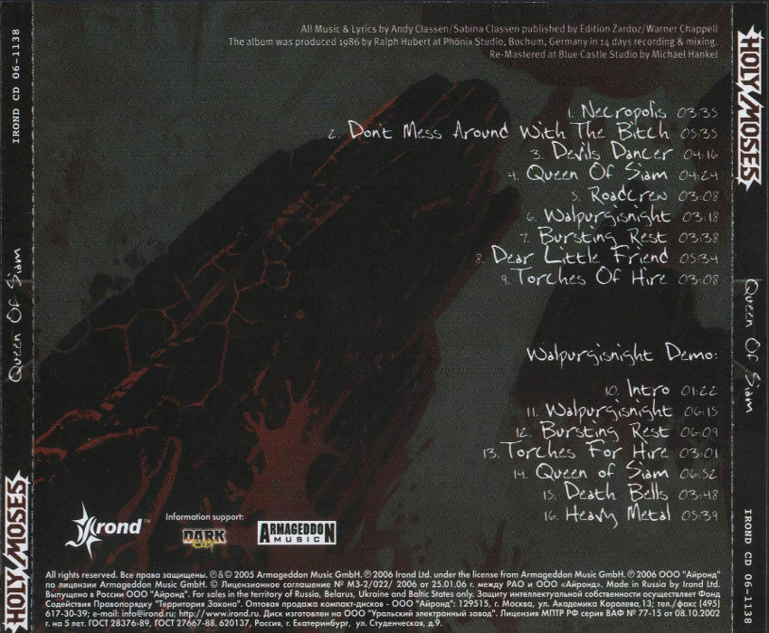 Album Description Available in: Queen of Siam is the debut album by Holy Moses, released in 1986 on AAARRG Records. It was re-released in 2005 with "Walpurgisnight" demo, recorded in 1984–1985, as bonus tracks. All music and lyrics are by Andy Classen and Sabina Classen.