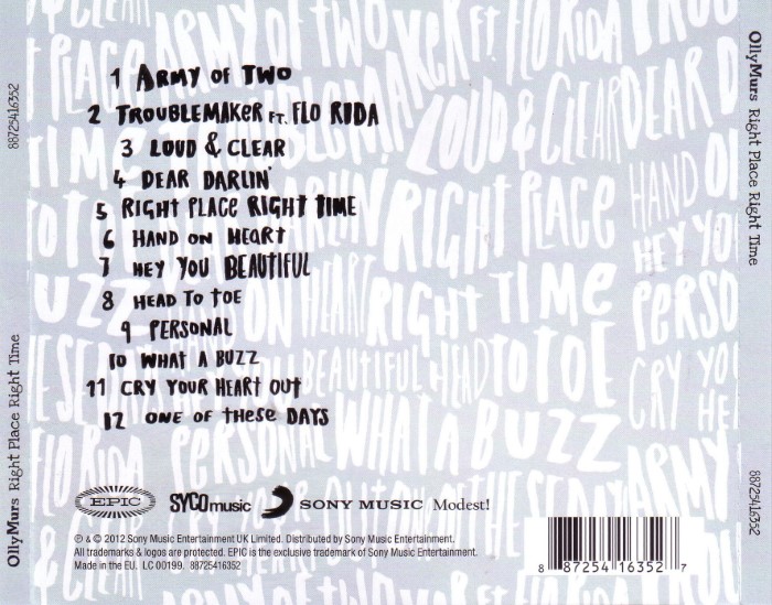 Right Place Right Time is the third studio album by English singer-songwriter Olly Murs, first released in the United Kingdom on 23 November 2012 by Epic Records. It became Murs's second UK number one album, with sales of 127,000 copies in its first week sale, making it the fastest selling album of 2012 by a male solo artist in the UK charts.