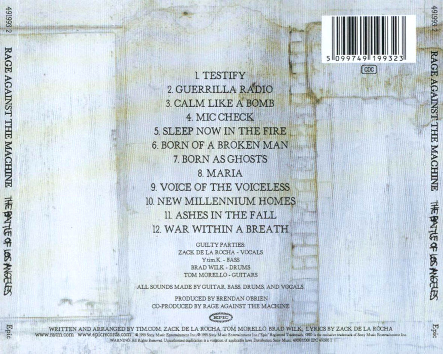 The Battle of Los Angeles is the third studio album by American rock band Rage Against the Machine, released on November 2, 1999 by Epic Records. The album was nominated at the 43rd Annual Grammy Awards for Best Rock Album, and was recognized by both Time and Rolling Stone magazines as the best album of 1999. The Battle of Los Angeles would be the last full-length studio album of original material by Rage Against the Machine before their breakup in 2000, although they did release a covers album that same year.