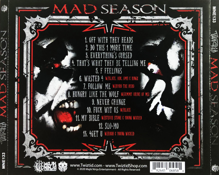 Mad Season is the thirteenth studio album by American hip hop duo Twiztid. It was released on April 20, 2020 through Majik Ninja Entertainment, with no prior announcement and during COVID-19 pandemic. Recording sessions took place at the Dojo in Michigan and at Inkling Studios in New Zealand. Production was primarily handled by Young Wicked, along with Godsynth, Fritz "The Cat" Van Kosky, A Danger Within, Charlie Beans, Jimmy Urine and ScatteredBrains. It features guest appearances from Axe Murder Boyz, Blaze Ya Dead Homie, Anybody Killa, Bingx, Ekoh, Hyro The Hero, Jimmy Urine and Stevie Stone.