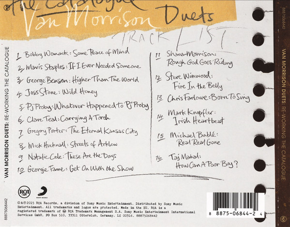 Duets: Re-working the Catalogue is the 35th studio album recorded by Northern Irish singer/songwriter Van Morrison. It was released on 13 March 2015 on RCA Records. Produced by Van Morrison along with Don Was and Bob Rock, it consists of songs previously recorded by Morrison this time recorded as duets. Performances include the artists Bobby Womack, Steve Winwood, Mark Knopfler, Taj Mahal, Mavis Staples, Michael Bublé, Natalie Cole, George Benson, Gregory Porter, Clare Teal, P.J. Proby, Joss Stone, Georgie Fame, Mick Hucknall, Chris Farlowe, and Morrison’s daughter Shana Morrison.