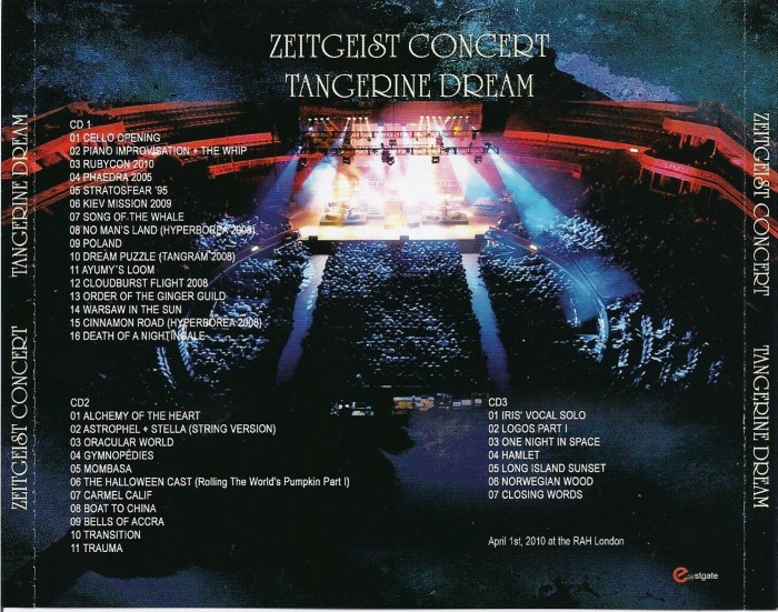 In April 1975 Tangerine Dream played the Royal Albert Hall in London for the first time. So it was the 35th anniversary in April 2010. In April 1970 TD released their first long-play album ever. This made a 40th anniversary in April 2010. So TD indeed had to celebrate something which they took account of by performing a chain of very popular 33 tracks (see tracklist above) – a choice which wasn’t easy at all considering a portfolio of more than 1,000 compositions over the decades….
