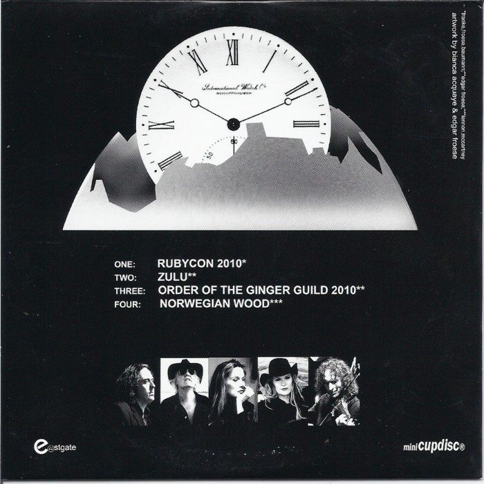 This mini cupdisc accompanied TD on the occasion of our European Tour 2010 (Lisbon, Barcelona, Paris, Zoetermeer, London) and reflects in time lapse manner the creative musical world of Tangerine Dream within more than 40 years. Just enjoy a newly recorded version of "Rubycon" (original release in 1975) from the so-called Virgin Years, a completely new track like "Zulu", the powerful new version of "Order Of The Ginger Guild" up to a great Beatles track everybody knows, the TD cover version of "Norwegian Wood".