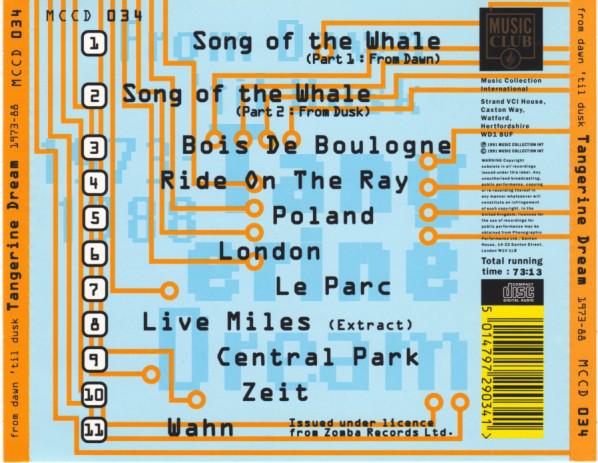 In 1991 the British company Music Collection released another compilation of well-known TD music. Like The Best Of Tangerine Dream two years before, From Dawn 'til Dusk (the title basing on the two parts of the composition Song Of The Whale) features music from 'The Pink Years' and 'The Blue Years.