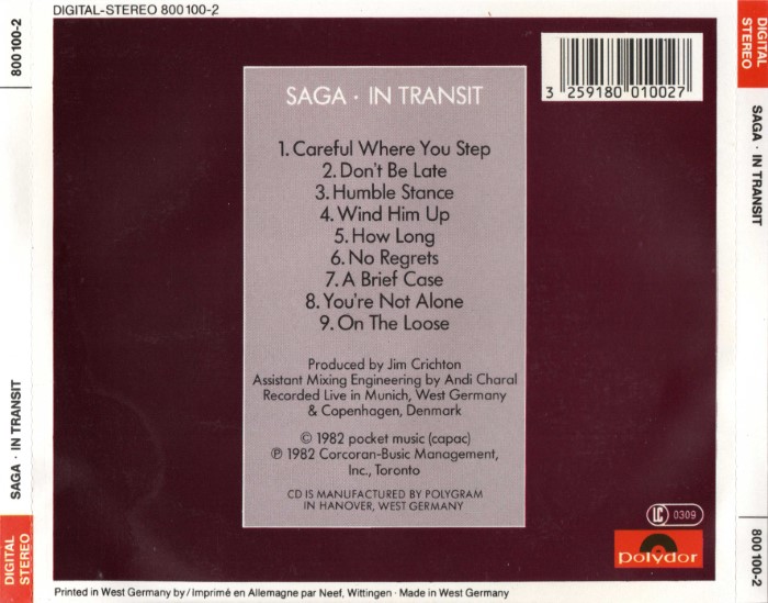 In Transit is a live album by Canadian progressive rock band Saga. The album was recorded at the Rudi-Sedlmayer-Halle in Munich on February 5, 1982 and at the Tivoli Concert Hall in Copenhagen on February 22, 23, and 24, 1982. The album went platinum in Canada, selling 100,000 copies and gold in Germany, selling 250,000 copies. The album reached #10 in Canada and was #58 in the Canadian year end chart.